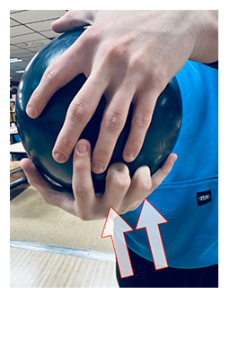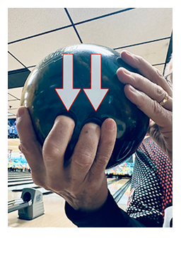 To have more forward roll on your ball, spread your pinky finger out away from your ring finger and keep index finger close to your middle finger. Your pinky finger is at about 8 o’clock and your other fingers are at 6 o’clock. Spreading your pinky finger keeps your hand from turning the ball and this can help when you want to play straighter down the lane and roll straighter at spares.